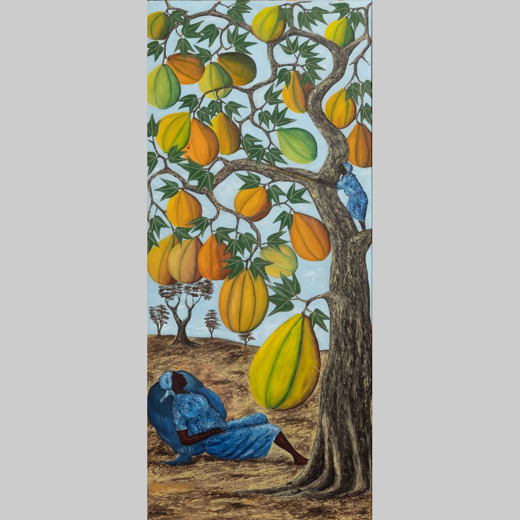 In the present painting Joseph fills the frame with a calabash tree, a tropical plant common in Haiti that produces large, round green gourds that become increasingly yellow orange as they ripen. He adds two women in traditional rural dress with headwraps. One, resting on the ground, looks up at the tree. The other, dwarfed by the vast tree, stands on one of its branches while harvesting.