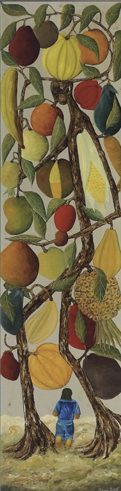 Born into poverty in Grande-Riviere-du-Nord, Haiti, Jasmin Joseph was working in a brick factory when he began carving terracotta sculptures. He used the first proceeds from sales of his sculptures to become literate. By 1950, Joseph had converted from Voduo to Protestantism, become a lay priest, and abandoned sculpture for painting. The McMullen’s work comes from a series begun in the 1960s depicting brightly colored fruit bearing trees growing in a barren landscape. He titled several of these paintings, some with figures, Tree of Life (see images).
